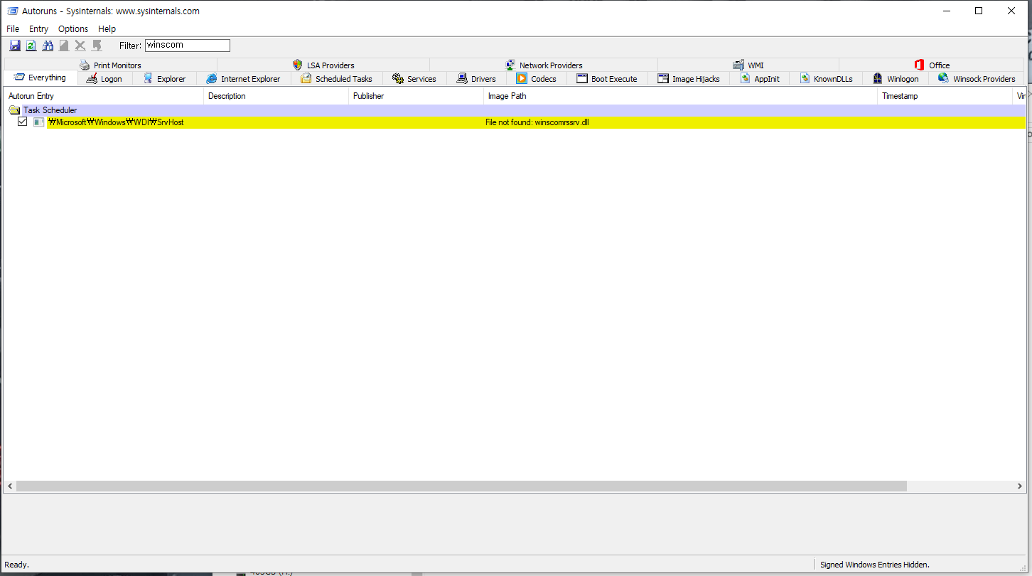 아마도 이 winscomrssvr.dll 은 악성코드의 찌꺼기인듯한데 system.ini나 msconfig, 고클린 등으로 지우기가 어렵다.