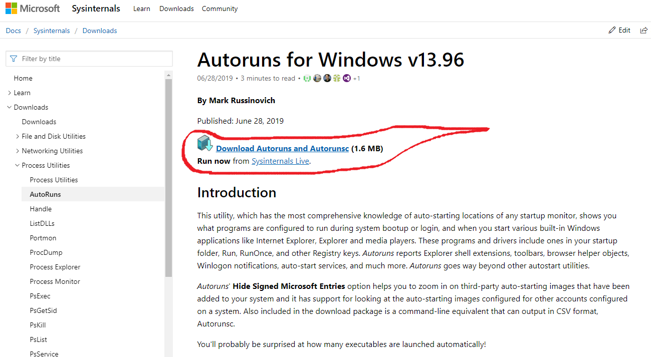 1. https://docs.microsoft.com/en-us/sysinternals/downloads/autoruns 에 접속한다.