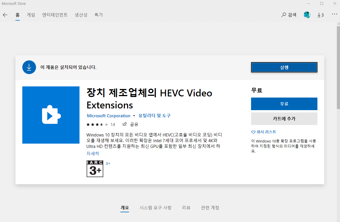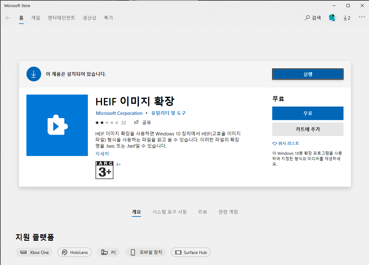 이 역시 우측 상단에 "무료"를 클릭하면 Microsoft Store 가 열리고, 다시 여기서 "무료"를 클릭하면 설치가 잠시 진행되고나서,