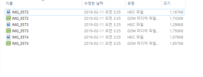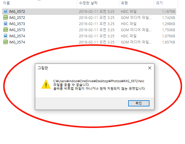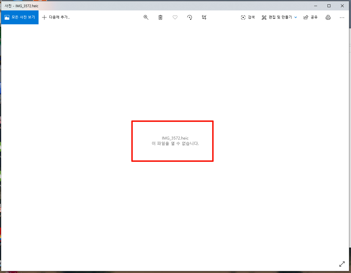 IMG_3572가 유형을 보면 HEIC파일인데 이 파일을 윈도10에서 두번 눌러보면 아래와 같은 화면이 뜬다.