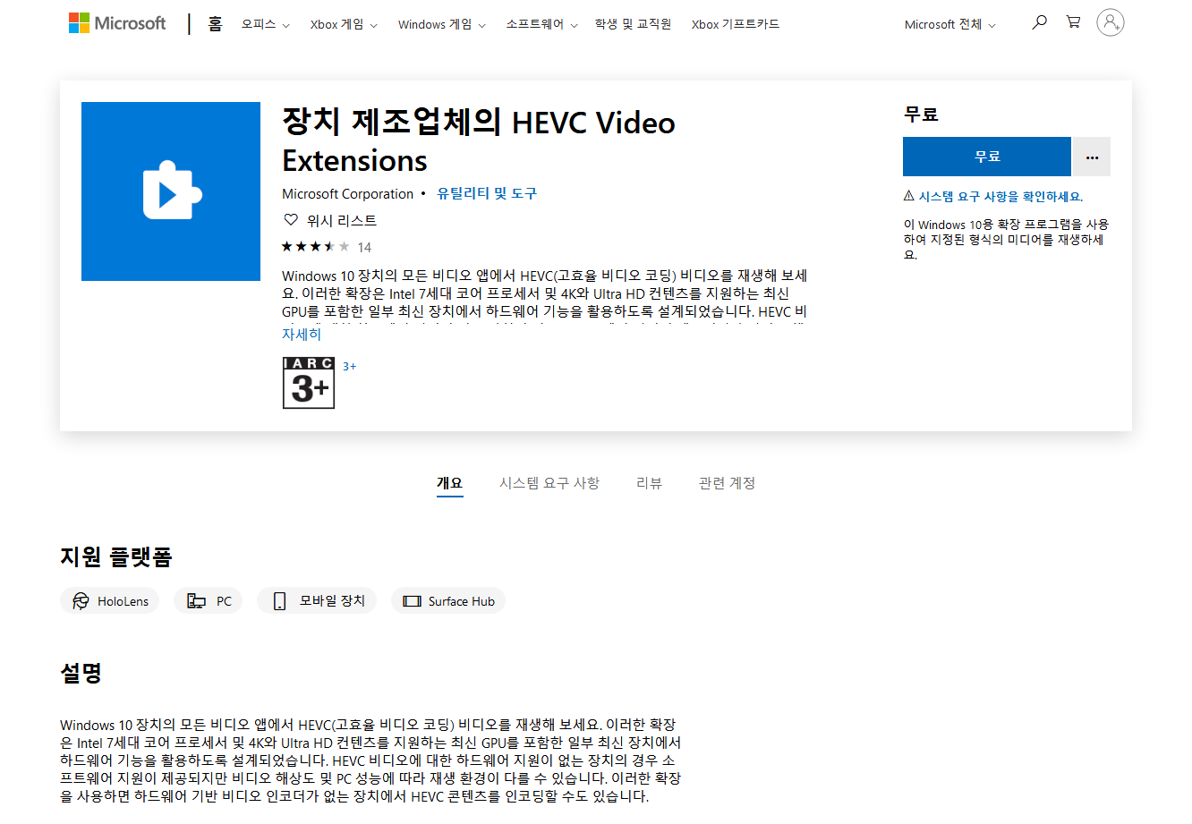 장치 제조업체의 HEVC Video Extensions 라는 파일이 필요하다.
