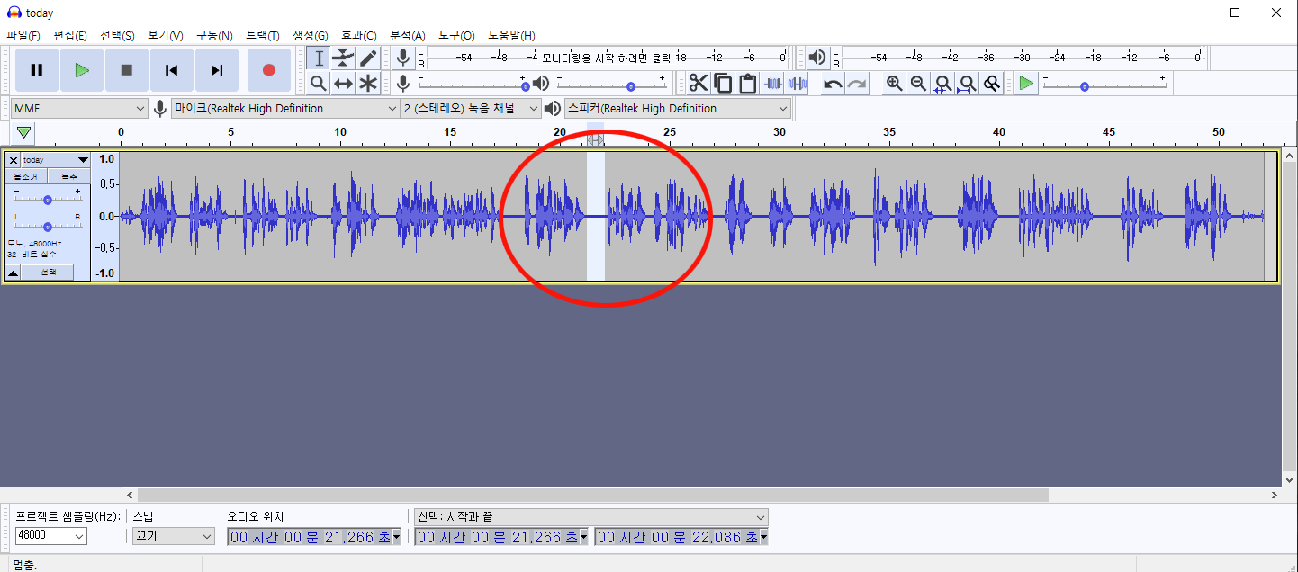 audacity 창에 today를 던져 넣으면 아래처럼 파형이 보이는 채로 열립니다.
