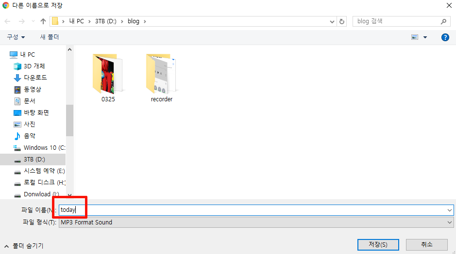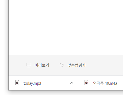 이름을 바꾸고 저장을 누르면 today.mp3파일로 저장이 되면서 아래화면처럼 브라우져 좌측 하단에 보입니다.
