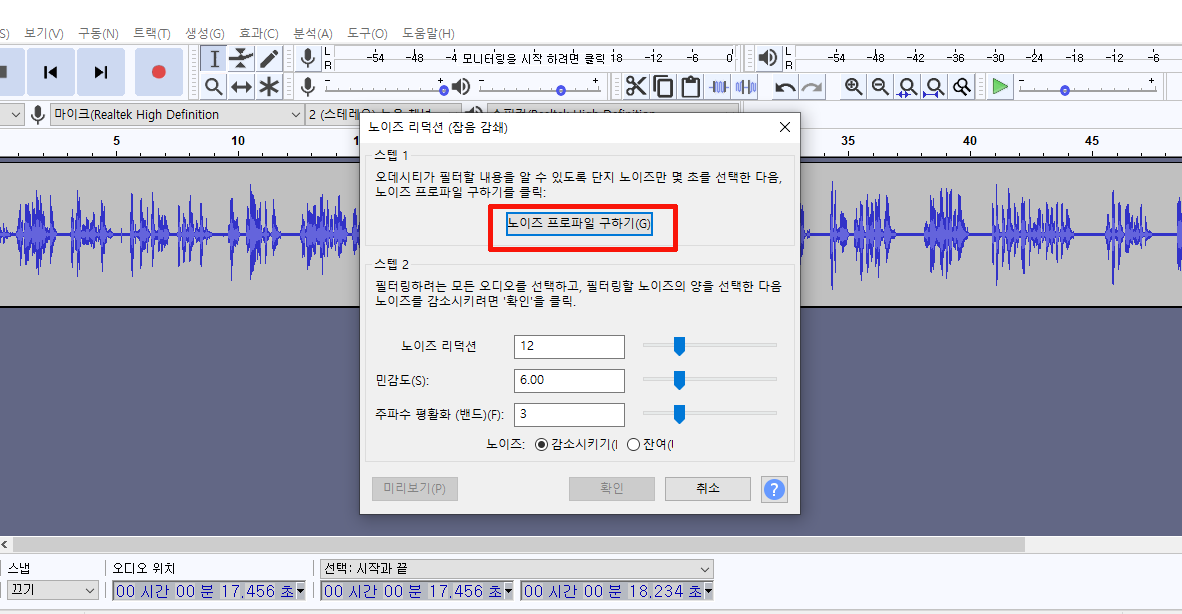 그러면 아래와 같은 화면이 나오는데 여기서 빨강색 네모친 "노이즈 프로파일 구하기"를 클릭합니다.