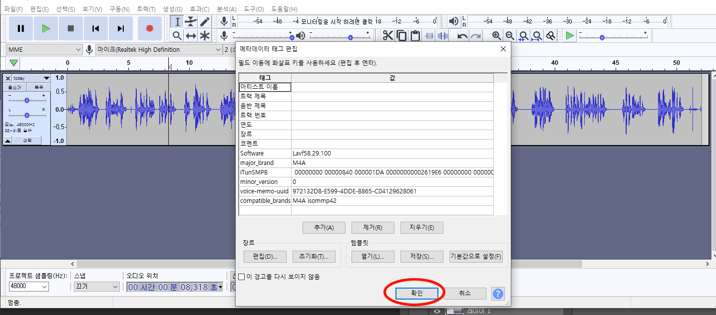 그런데 이 파일의 확장자가 m4a 여서 audacity에서 열리지 않습니다.