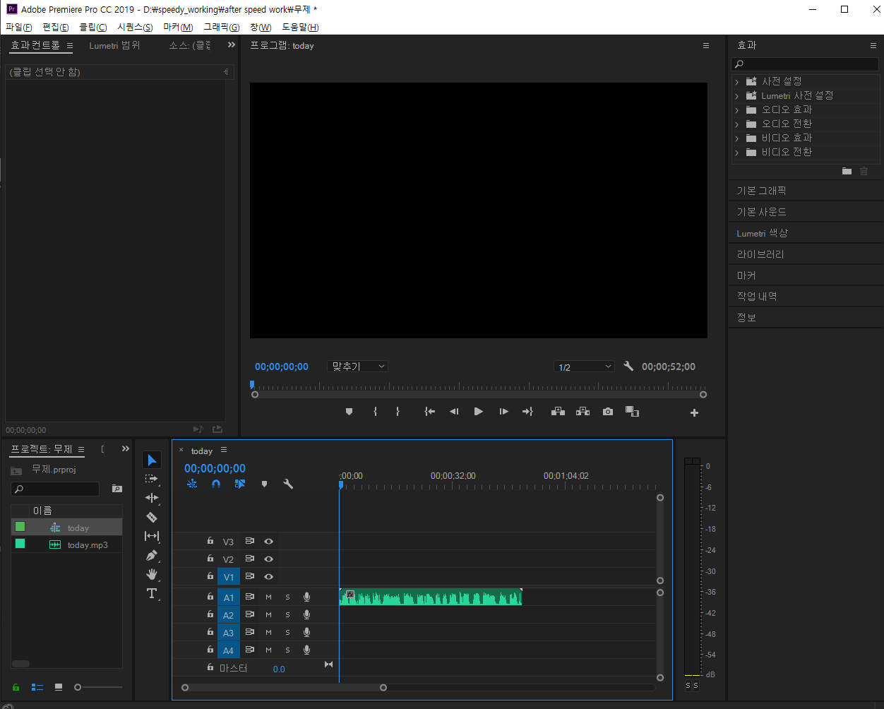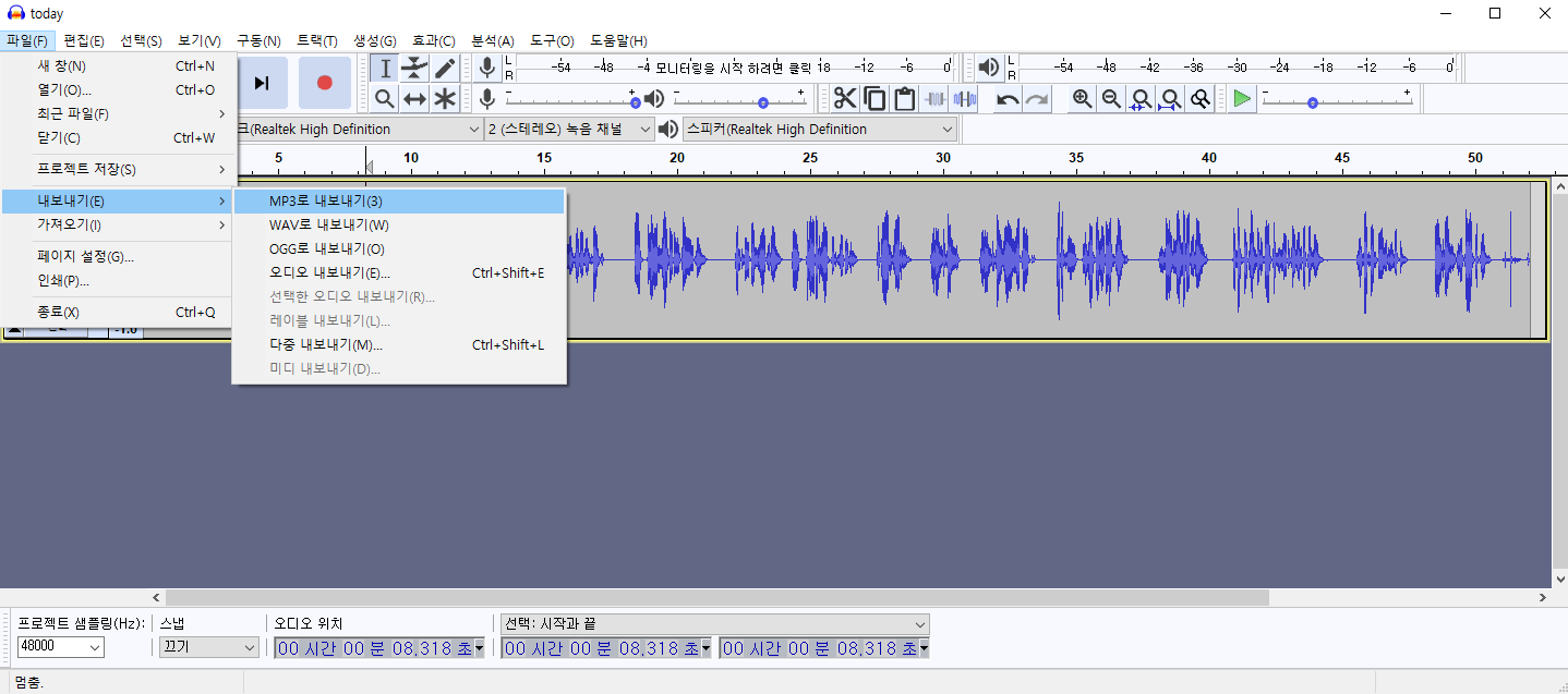 이제 이 today 이름을 가진 mp3 파일을 audacity 에서 열 수 있습니다.