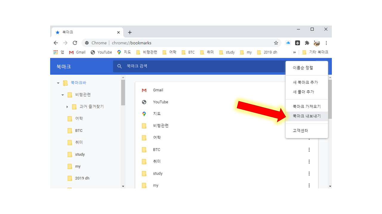 그러면 아래 화살표가 가리키는 곳처럼 "북마크 내보내기"가 나옵니다. (현재 크롬입니다.)