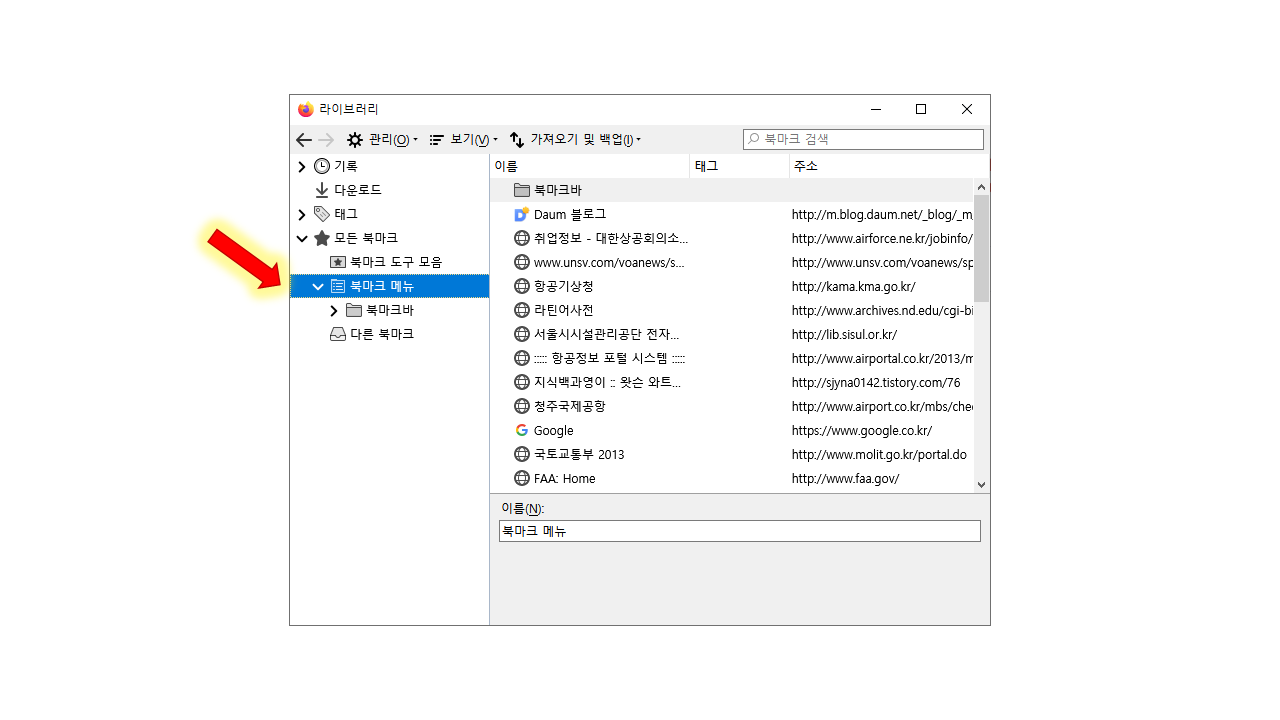 4. 북마크 메뉴 클릭 해서 북마크 제대로 들어온 것 화인후 "북마크바" 왼쪽 상단으로 드래그앤 드롭