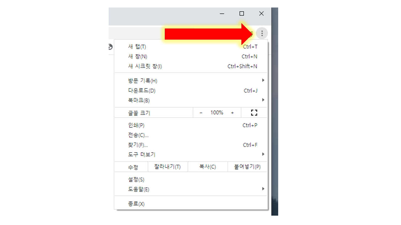 크롬(chrome)에서 오른쪽 위에 있는 점 3개를 누릅니다.(현재 크롬입니다.)