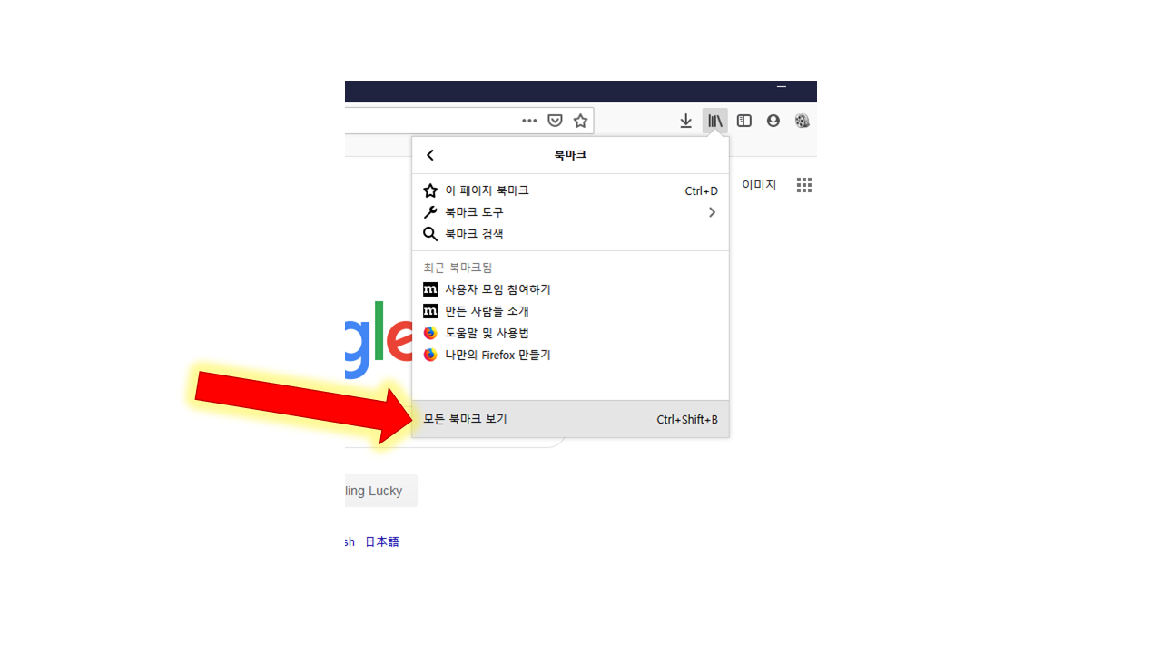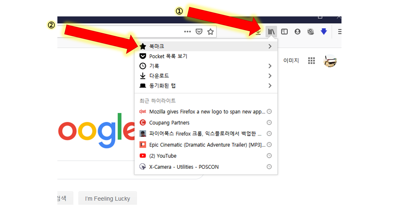 파이어폭스의 맨위에 오른쪽에 있는 ①책이 4권중에 오른쪽 한권이 비스듬히 기대고 있는 아이콘을 누릅니다.