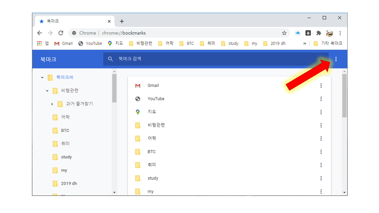 1. 크롬 상단에서 점3개를 눌러서 북마크 → 북마크 관리자