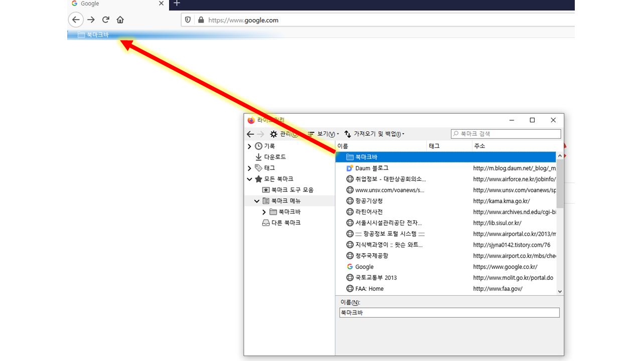 여기서 맨위에 표시된 "북마크바"를 마우스로 끌어서 아래 화살표에 표시된 곳에 놓습니다. (드래그 앤 드롭)