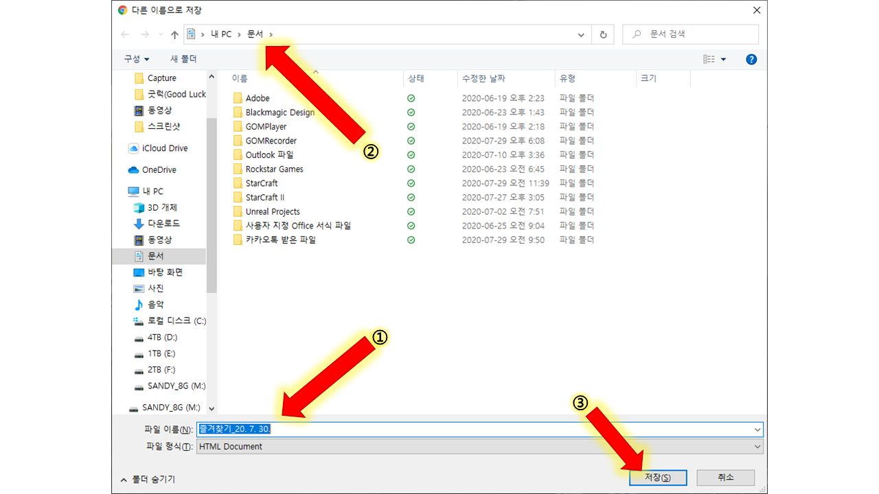 제일먼저 ①파일 이름확인하시고요. ②파일이 저장될 경로 확인합니다. 그리고 ③ 저장 을 누릅니다.