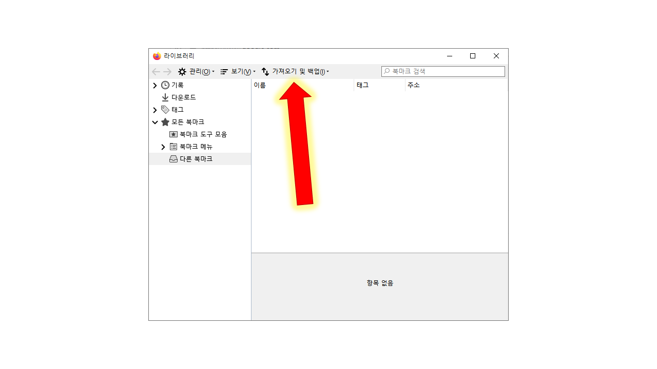 2. 라이브러리 창에서 "가져오기 및 백업" → HTML에서 북마크 가져오기 클릭