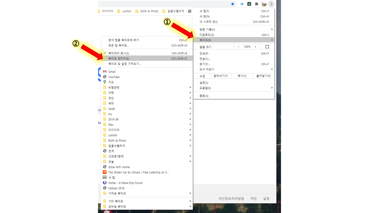 쭉 내려오는 메뉴바에서 화살표 된 ①번 북마크를 누르고 ②북마크 관리자를 누릅니다.(현재 크롬입니다.)