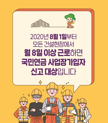 정부가 2018년 8월 국민연금법 시행령을 개정하면서 건설공사 현장에서 월 8일이상 근로하는 건설일용근로자에게도 국민연금 가입을 확대하기로 했었고, 그 당시 진행중이었던 공사는 2020년 7월31일까지 2년간 유예하게 했던 기간이 종료가 되어, 2020년8월1일부터 건설공사 현장에서 일하는 건설일용근로자도 국민연금의 의무가입 대상이 되었습니다.