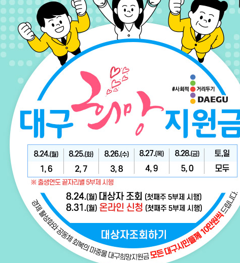 또한 지난번 코로나19 대유행지로 떠들썩했던 대구시도 2차 긴급생계자금을 모든 시민에게 10만원씩 지급하기로 했습니다. 완주군과 조금 다른점은 정부의 재난지원금이 종료되는 8월31일 이후 9월1일부터 생계자금을 지원한다고 했습니다.