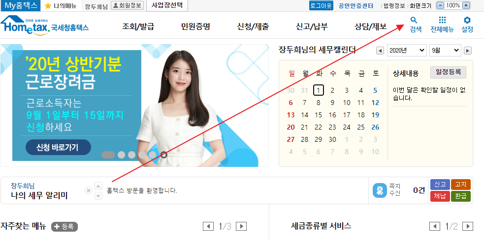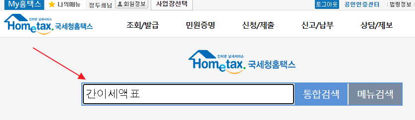 홈택스(누르면 홈택스로 갑니다)를 들어가서 위에 있는 검색을 누릅니다.
