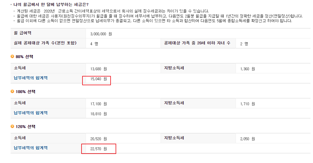 여러분들도 한번 각자 급여와 가족수, 20세미만 자녀수를 입력하고 계산을 해보세요.
