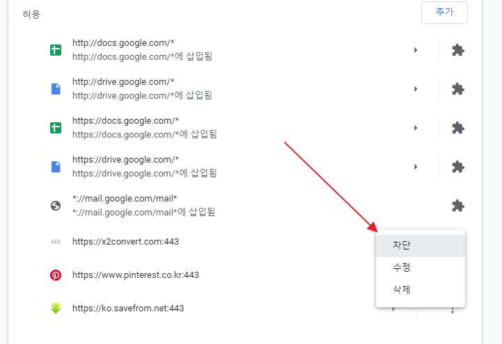 그러면 이제 "허용"의 위쪽에 "차단"한 사이트에 올라가게 됩니다.