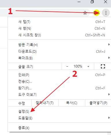 크롬의 오른쪽 위를 보면 X표 밑에 세로로 된 점 세개가 있습니다. 그 점3개를 누르고 "설정"을 누릅니다.