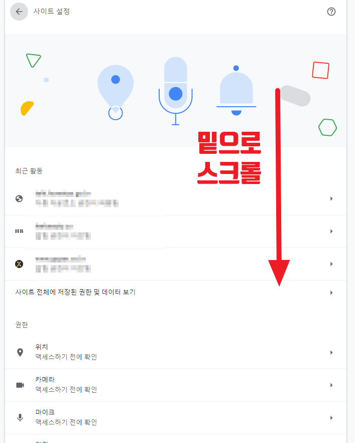사이트 설정을 누르면 아래와 같은 화면이 나오는데, 여기서 조금만 스크롤을 합니다.