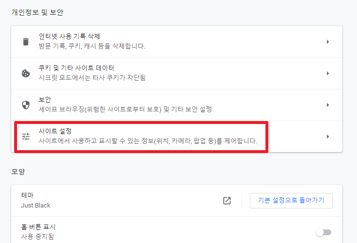 안전확인 바로 밑에 아래그림처럼 "개인정보 및 보안" 이 있고 하위항목에 "사이트설정"이 있습니다.