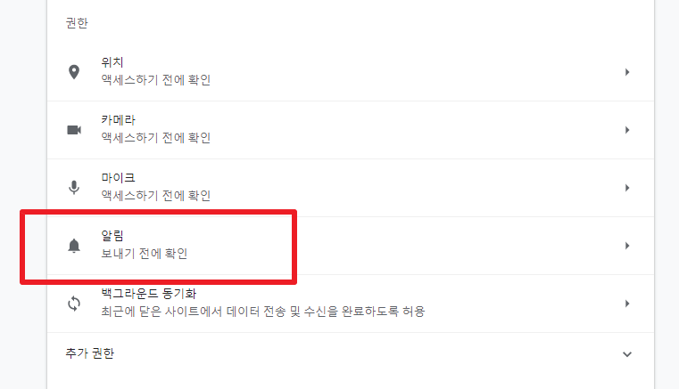 "권한" 항목의 하위에 "알림" 이 있습니다. 클릭!