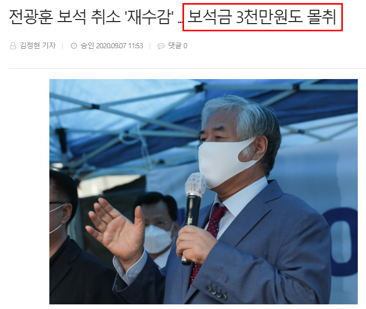 전광훈 목사 관련 뉴스에 "보석금 몰취"라는 단어가 나왔습니다.