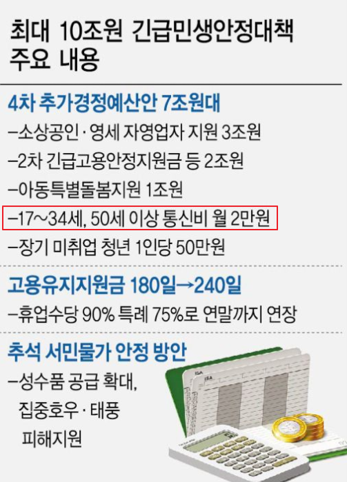 당정은 17~34세, 그리고 50세 이상에 월 2만원의 통신비를 지원하는 방안도 고려 중이라고 하는데요. 소득역진성을 감안해 경제활동이 많은 35~49세를 제외한 것인데 선정 기준이 모호해 논란이 예상됩니다. 이 통신비는 정부의 직접 지원 대신 이동통신사 등 통신사업자가 요금을 감면하면 정부가 이를 보전하는 방식이 유력하다고 합니다.