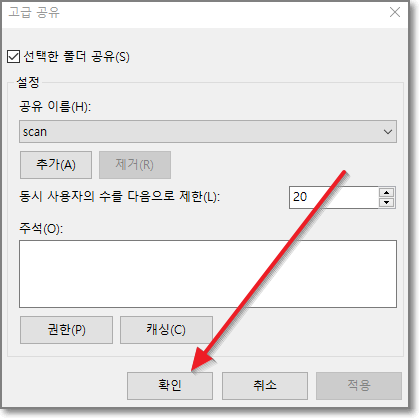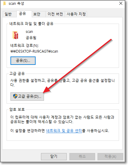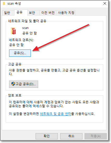 scan속성 창에서 "공유"탭을 클릭합니다.