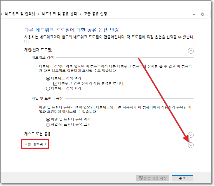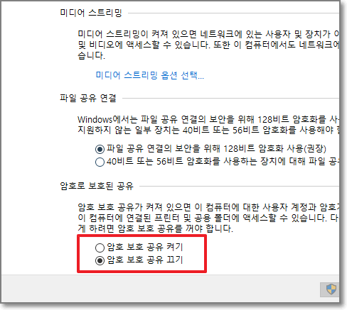 아래처럼 반드시 "암호 보호 공유 끄기"가 되어있어야만 합니다. 중요합니다.