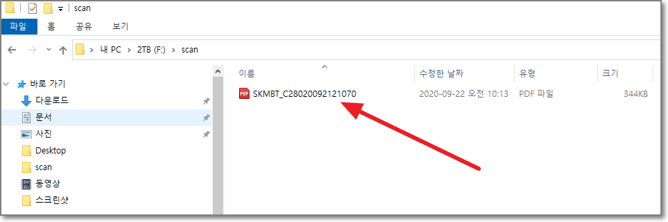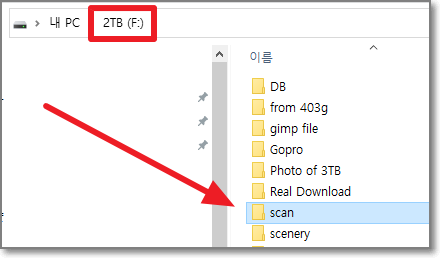 그러면 이제 스캔이 제대로 들어오는지 확인을 해봐야겠죠? 아래처럼 탐색기를 열어서 지정한 스캔폴더로 가줍니다.