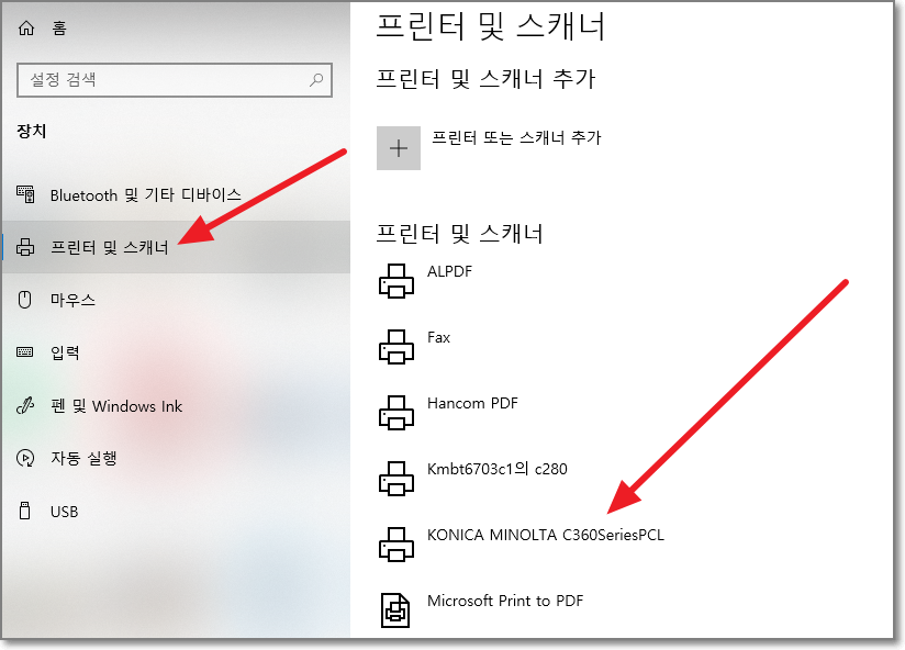 프린터 및 스캐너를 누르고 오른쪽에 나오는 KONICA MINOLTA C360SeriesPCL 을 클릭합니다.