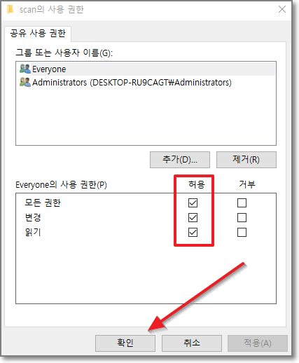 Everyone의 사용권한(P)에 허용 밑에 세군데 모두 체크가 되있어야 합니다. 안되있으면 체크하시고 "확인"을 누릅니다.