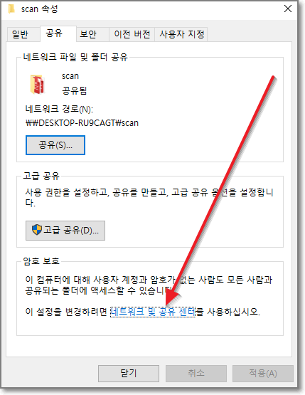 scan속성에서 아래 "네트워크 및 공유센터"를 클릭합니다.