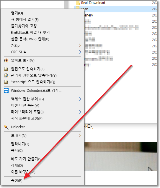 만들어진 scan폴더를 마우스 오른쪽 버튼으로 클릭해서 맨 아래 "속성"을 누릅니다.