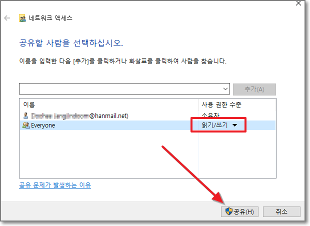 추가된 Everyone의 오른쪽에 "읽기"를 누르고 "읽기/쓰기"로 선택을 합니다.