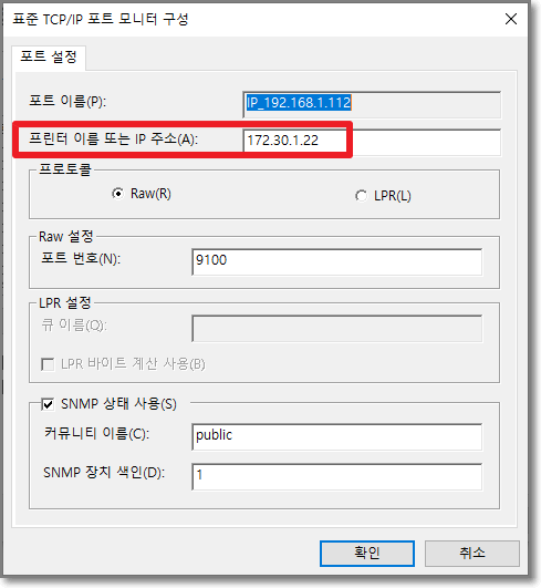 아래 빨간 박스에 보시면 이 프린터의 IP주소는 170.30.1.22 입니다. 컴퓨터마다 다를 수 있으니 꼭 위에 나온대로 해서 프린터IP를 얻으시길 바랍니다. 알아낸 프린터 아이피는 종이에 적어놓던지 아니면 메모장을 열어서 복사해놓으시면 편합니다. 이제 이쪽에서 볼일은 끝났으니 확인을 눌러서 닫으셔도 되고 X표시 눌러서 닫으셔도 됩니다.