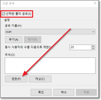 선택한 폴더 공유에 체크가 되어있는 것을 확인하고 밑에 있는 "권한"을 누릅니다.