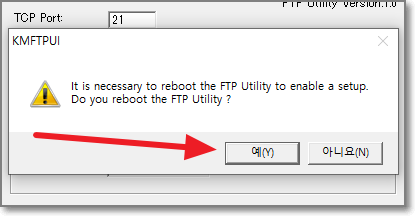다음과 같이 FTP Utility를 재부팅 할거냐고 묻습니다. 이게 컴퓨터 재부팅이 아니고 프로그램 재실행입니다. "예(Y)" 누른다고 컴퓨터가 재부팅 되지는 않습니다. "예(Y)" 를 누르세요.