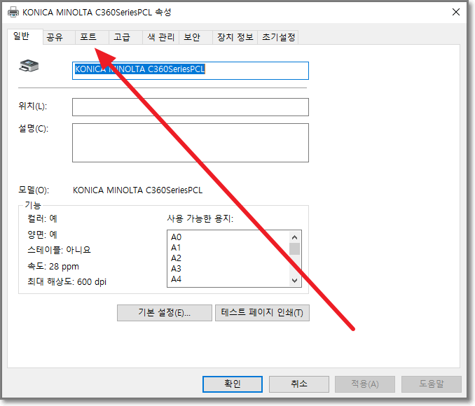 KONICA MINOLTA C360SeriesPCL 속성 창에서 "포트"를 누릅니다.