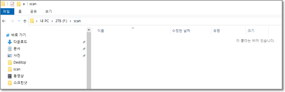 탐색기를 실행해서 스캔을 받을 폴더를 하나 만들어줍니다. 저는 F드라이브에 scan이라는 폴더를 만들어줬습니다.