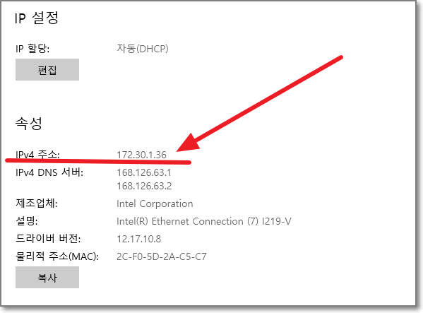 속성쪽에 IPv4 주소가 나오는데요. 제 컴퓨터는 172.30.1.36 이네요. 적어두거나 메모장에 복사해놓습니다.