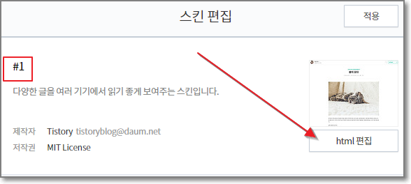 스킨이름은 #1 인 것을 반드시 확인해주시고, html편집을 누릅니다.
