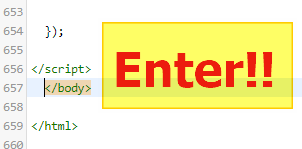 </body>앞에 마우스 커서를 두고 클릭한다음 "엔터"키를 한번 쳐서 밑으로 내립니다.