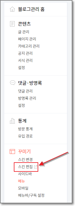 우선 관리자 메뉴로 가서 "스킨편집"을 누릅니다.