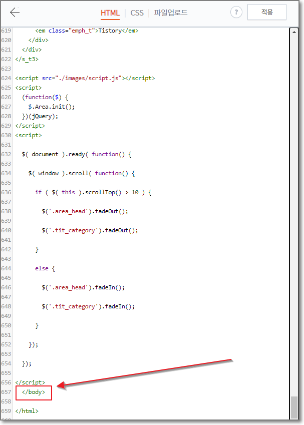 스크롤을 맨 밑으로 내리시고 </body> 를 찾습니다.