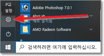시작버튼을 누르고 톱니바퀴 "설정"을 누릅니다.