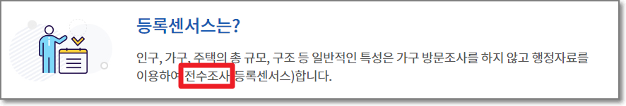 등록센서스는 Regester-based Census의 우리말로써 행정자료를 이용한 "전수조사"를 뜻합니다.